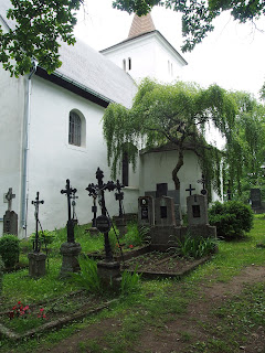 The sign pointed to the right, but the arrow pointing left said "Cemetary 300m". I was curious enough to take a 0.6km detour although my legs burned and I was dizzy with fatigue after the climb in a humid weather. Black clouds were towering over the horizon, signalling some afternoon storms. At the end of the detour trail, I found a small church and a cemetary. There was nobody around, the place was absolutely quiet, bird songs that I heard since the morning stopped abruptly. This was an old German cemetery, a place called Mouřenec, likely a Czech modification of St. Moritz. A nearby kiosk described this hill and church as a "place rich in legends". I bet, it felt downright spooky.